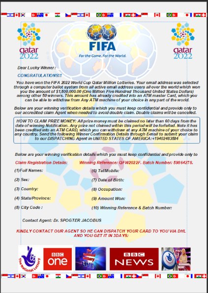 Az alábbi, e-mailes mellékletként érkezett példához hasonlóan a nyereményről szóló értesítés tartalmazhatja egy állítólagos kapcsolattartó nevét, aki segíthet a nyeremény átvételében. Ez a személy egy bizonyos ponton azzal keresi fel az áldozatot, hogy mielőtt ténylegesen megkaphatná a nyereményét, fizessen be előzetesen valamilyen adót vagy díjat. Amint az utalás megtörtént, a támadók elérték céljukat: a pénz mellett személyes adatok birtokába jutottak, amelyekkel később további csalásokat hajthatnak végre vagy eladhatják az adatokat más kiberbűnözőknek.