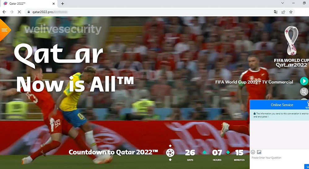 Az alábbi weboldal a labdarúgó-világbajnokság hivatalos weboldalának adja ki magát, ehhez valódi URL-t, a https://www.qatar2022.qa/ címet utánozva, a különbség mindössze annyi, hogy a csalók a .pro-t használják a domain végén (angolul top-level domain, azaz legfelső szintű tartomány). A kiberbűnözők egy külön “portált” is létrehoztak, amelyen keresztül az emberek látszólag megvásárolhatják jegyeiket, először azonban személyes adatokat kérnek, amelyekkel visszaélhetnek vagy azonnal eladhatják más csalóknak.