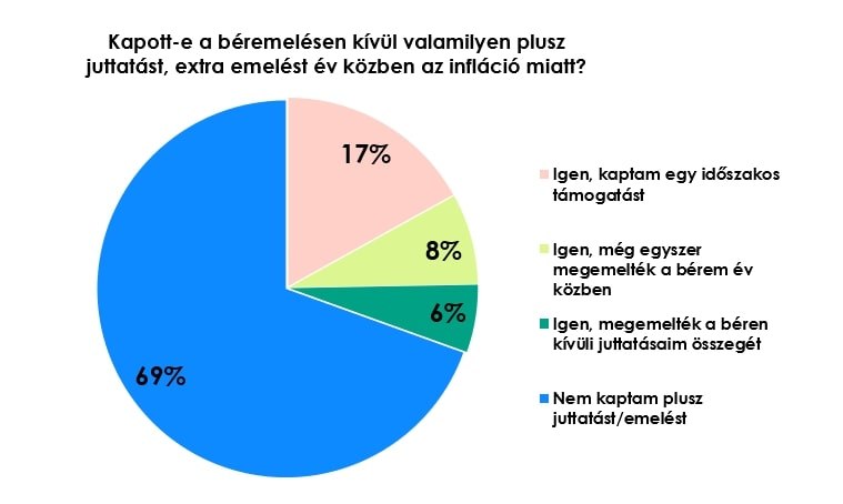 Évközi, elsősorban az infláció hatásait mérsékelni hivatott támogatásról viszont már a válaszadók 31 százaléka számolt be: ezen belül 6 százalékot tett ki a béren kívüli juttatást, 8 százalékot az évközi béremelést és 17 százalékot az időszakos támogatást kapók aránya.