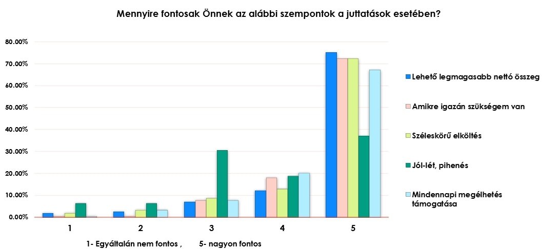 A kutatás egyértelműen rávilágított arra is, hogy a munkavállalók számára – az összegen felül – a gyakorlati haszon is kiemelten fontos a juttatások esetében: egy ötpontos skálán a válaszadók 75 százaléka adott maximális pontszámot a lehető legmagasabb nettó összegre, viszont 72 százalékuknál az is kiemelten lényeges szempont, hogy olyan juttatást kapjon, amelyre igazán szüksége van, és a széles körű elköltési lehetőség biztosított legyen. A válaszadók közel 68 százalékánál a mindennapi megélhetés támogatása is maximális pontot kapott, viszont a jól-lét, a pihenés biztosítása már csak a megkérdezettek 37 százalékának volt fontos.