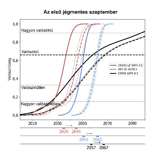 Fig. 1. A modellek szerint várható időpontok valószínűség eloszlás sűrűségfüggvénye, amikor a Jeges-óceán szeptemberben jégmentessé válik. Három különböző modell, három különböző kibocsátási forgatókönyvre: Community Earth System Model 2, piros; Max Plank Institute Grand Ensemble, kék; és a Coupled Model Intercomparison Project (CMIP6) 21 modellje, fekete folytanos vonallal. Ha figyelembe vesszük a legköri cirkulációra való modell-érzékenységet, a sűrűségfüggvények eltolódnak (szaggatott vonalak; a vékony szaggatott vonalak a bizonytalanság becslései): mindhárom modell sokaság egységes körülbelül egy évtized csúszást jelez az első jégmentes nyár időpontjának valószínűségét tekintve (lásd az éveket az x-tengely alatt).