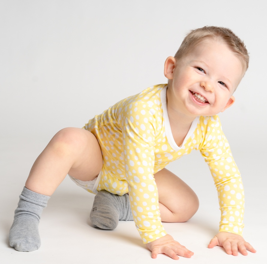 Ezt a rugalmasságot az általunk készített ruhák 5 százalékos elasztán-tartalma is fokozza, mely megkönnyíti a kisebb babák öltöztetését is. Sőt, a rugalmas ruhadarabokat egy fejlődőben lévő, növekvő gyermek akár hónapokkal tovább is hordhatja, mint egy hagyományos, pamut babaruhát.