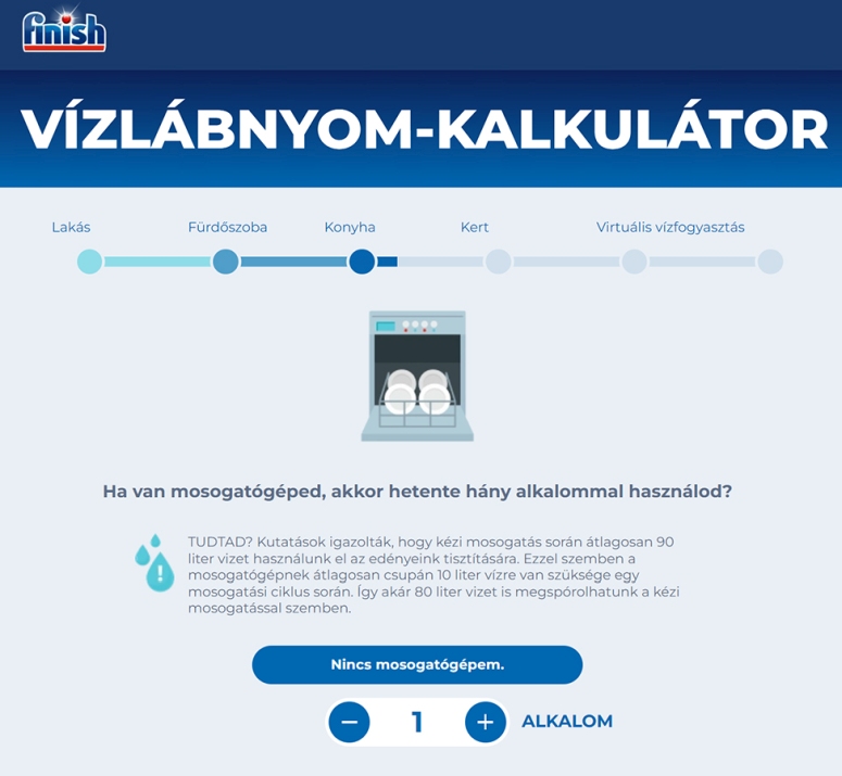 „Ezek az adatok is rávilágítanak arra, hogy az életmódunk és a szokásaink nagyban befolyásolják a vízfelhasználásunkat. Fontos felhívni a figyelmet arra, hogy ezen mindannyian könnyen javíthatunk, ha tudatosabb fogyasztókká válunk, akik a valós szükségleteik alapján szerzik be a termékeket és odafigyelnek a háztartásukra. Ezért is hoztuk létre a Finish Vízlábnyom-kalkulátort, amellyel mindannyian pontosabb képet kaphatunk a fogyasztásunkról” – mondta Szinetár Zsófia, a Finish brand marketing menedzsere.