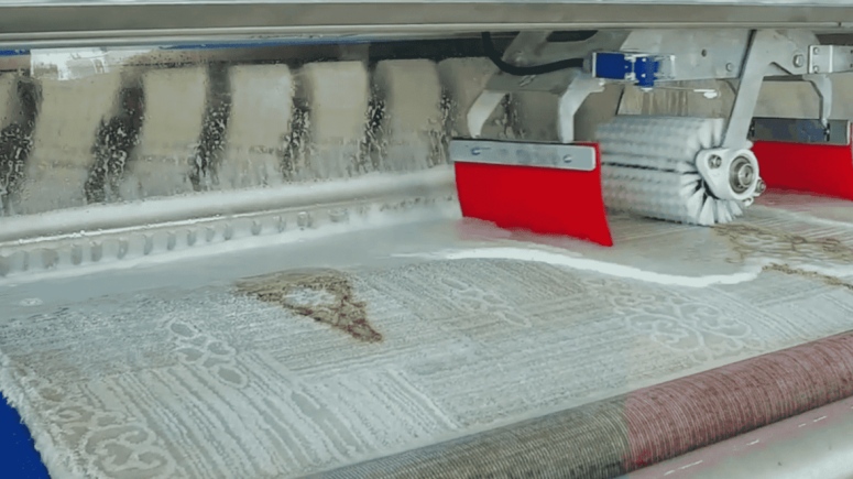 A második gép a multi-kefés szőnyegtisztító automata. De mielőtt behelyeznénk a tisztítás alatt lévő szőnyeget, előtte egy tisztítószeres oldatba beáztatjuk a kelmét. A behatási idő elteltével, ami körülbelül 5-6 perc, tisztítószertől függ. A jól beáztatott textil az automata rendszerben folytatja útját, ahol kefés súrolást egy mega hengerkefe nyitja, majd a tisztítószeres zuhanyt követően 5 darab síkban forgó tányérkefe veszi kezelésbe a szőnyeg szálait, végül a magasnyomású öblítés után a szőnyeg alját is átkefézi egy nagy henger alakú kefe.