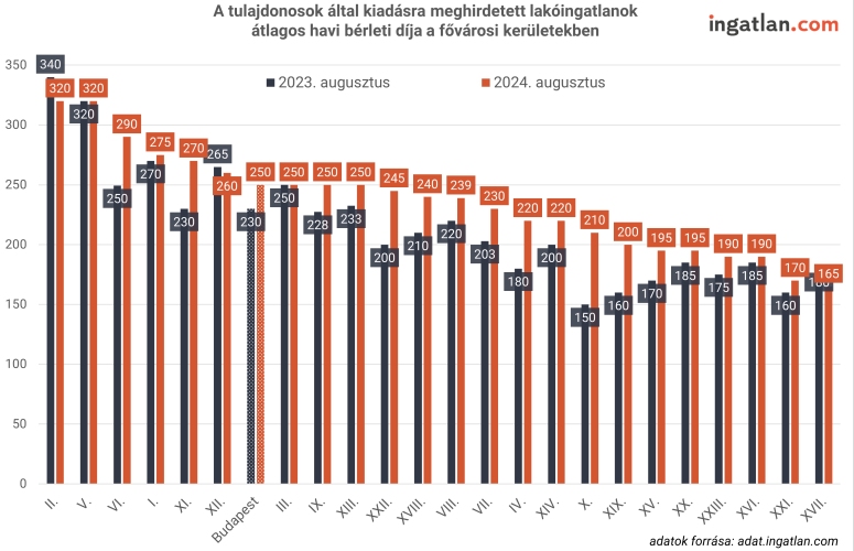 Az ingatlan.com elemzése szerint augusztus elején kiadásra hirdetett lakóingatlanok átlagos bérleti díja Budapesten 250 ezer forintot tett ki. A legnagyobb kínálatot nyújtó kerületek közül a XI.-ben 270 ezer, a XIII.-ban 250 ezer, a VIII.-ban pedig 239 ezer forint az átlagos bérleti díj.