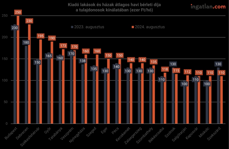 A vármegyeszékhelyek albérletpiacait nézve látható, hogy továbbra is Debrecen a legdrágább, ahol 230 ezer forint az átlagos bérleti díj. A legolcsóbb pedig Kaposvár és Miskolc, ahol egyaránt 110 ezer forint az átlagos lakbér az ingatlan.com adatai szerint. Az további egyetemvárosok közül Győrben 190 ezer forintos átlagos bérleti díjjal számolhatnak a bérlőjelöltek, ugyanez Szegeden 160 ezer, Pécsen pedig 150 ezer forint.