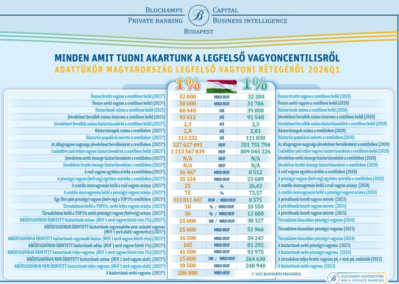 A Blochamps 2025 félévi vagyonréteg-becslése szerint a legfelső 1% – mintegy 40.400 háztartás – összesen körülbelül 50.000 milliárd forint nettó vagyonnal rendelkezik. A jelenlegi számítások alapján az 1 milliárd forintos küszöb kérdés nagyjából 25–30 ezer háztartást érinthet, amelyek együttes nettó,küszöb feletti vagyona mintegy 16.500 milliárd forint. De azt is látni kell, hogy ennek a vállalkozói elitnek cégstruktúrákon, tőkealapokon keresztül működő cég- és befolyás hálója csak részben kerül fel a céges tulajdonrészeket számontartó lakossági vagyonösszesítő statisztikákba, azaz a valóságos méret az MNB adatokat biztosan meghaladja.
