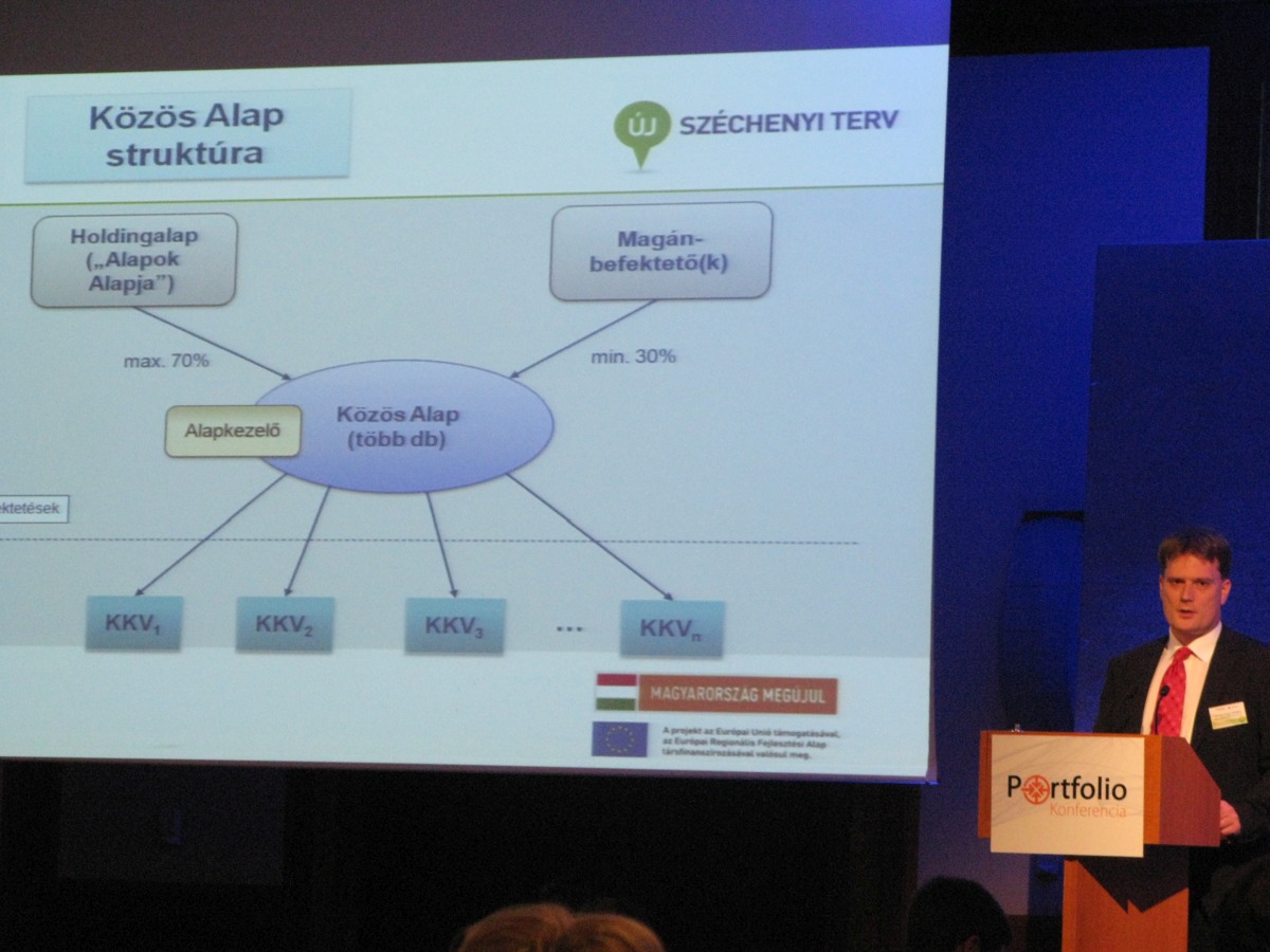 A probléma ebben egyedül ott lehet, hogy az EU által támogatott programban összesen 4 év alatt 45 milliárdot kellene elköltenie a 8 tőkealapnak (ebből 31,5 mrd-t az EU ad, a többit az alapok magántőke befektetői adják). Tehát ha időarányosan végzünk egy gyors fejszámolást, akkor akkor évente kb. 11,25 mrd-t kellene elkölteni befektetésre a hazai piacon. Tehát az eddig nyitva álló másfél év alatt már 16,875 mrd-t kellett volna startupokba kihelyezni. (Megjegyzem: az első közel fél év az alapok felállításával telt el, csak utána indulhatak a befektetések) Most akkor ez hogy is van? Pláne, ha az eddigi piaci információk szerint úgy tudtam, hogy a 8 tőketársaságnak valójában egy szigorú éves terv alapján kell haladnia, és teljesítenie kell az éves kihelyezési penzumot… vagy most akkor mégsem? – gondoltam egyszerűbb, ha erről a szünetben megkérdezem az illetékest, az MV Zrt. konferencián előadó képviselőjét