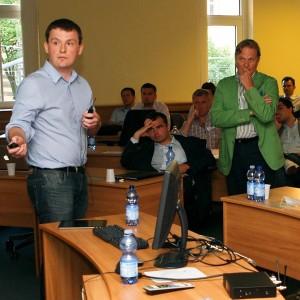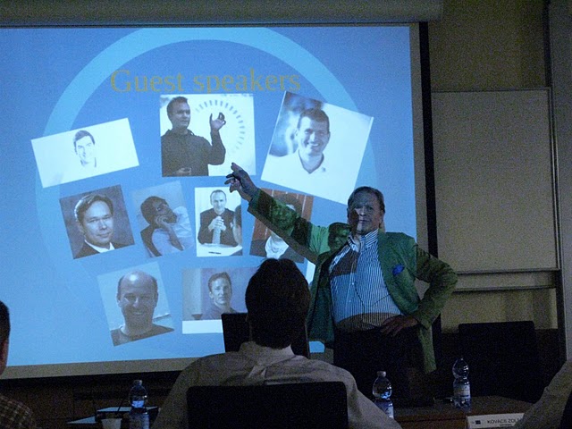 világutazó Peter, rikítóan zöld zakóban, mindenkit megragadó vehemenciával és mindent elsöprő lelkesedéssel indította az angol nyelvű bemutatóját. Egyből példát mutatva arról, hogy az igazi „entrepreneur” igazából csak egy nagyon rámenős, életvidám, és tettre kész alkat lehet, aki nem ismer lehetetlent – még akkor sem, ha a prezentációját kiszolgáló Prezi.com-os anyagban néha elakad az animáció fonala vagy megvicceli a mikrofon. Vagy Peter akkor nem ismert kegyelmet, ha az egyik startup nem adta le időre a prezentációját! Hiszen ezt a csapatot, a kurzusvezető mesteri szigorral nem engedte fellépni – respekt a következetességért! Ez itthon hiány.