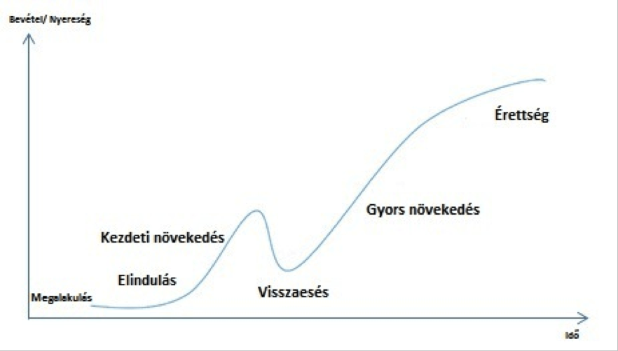 Steve Blank- vállalkozó, író és egyetemi tanár a Stanfordon- a What’s a startup? First principles című tanulmányában így fogalmazza meg a startupok lényegét[5]: a startup egy skálázható és hosszútávon fenntartható és ismételhető üzleti modellt kereső, ideiglenes szervezet (Blank 2010). A startupokra általánosságban igaz, hogy egy olyan egyszerű ötletre épülnek, ami a későbbiekben nagyra nőheti ki magát. Az ötlet továbbgondolása és annak megvalósítása a vállalkozás hirtelen nagymértékű növekedését eredményezheti, ami az ügyfélkör jelentős kibővülésével jár. A skálázhatóság azt jelenti, hogy a vállalkozás az indulástól fogva számol ezen növekedés lehetőségével, azt rugalmasan és dinamikusan tudja követni. Ehhez mérten alkotja meg és gondolja újra az üzleti modelljét, amely alkalmassá teszi arra, hogy működőképes maradjon ugyanúgy a több millió, mint a kezdeti párszáz ügyfél mellett. Az ötletgazdák iterálnak, újragondolják a termék/szolgáltatás koncepcióját. Finanszírozási oldalról nézve a skálázhatóság azt is magában foglalja, hogy a kezdeti forrásszűkösség miatt a hosszútávú célokért néha rövidtávú áldozatokat kell hozni. A menedzsmentnek fontos tudnia, hogy a vállalat életében mikor jön el az idő arra, hogy bizonyos részesedésért cserébe újabb, nagyobb volumenű tőkét vonjon be. A startup vállalkozás életgörbéje az 1. ábrán látható.
