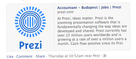 Mostanában ritkán írunk a Preziről. Mert felénk (?) nem kommunikál. Biztos nagy. Mi kicsik. (stop) De Facebook-ozik. És rengeteg HR-hirdetése van. (stop) Immár a sajtó (közösségi?) üzenetei is ott jönnek le. Azaz olvassunk HR-t! (stop) Íme a mai HR-info. (stop)