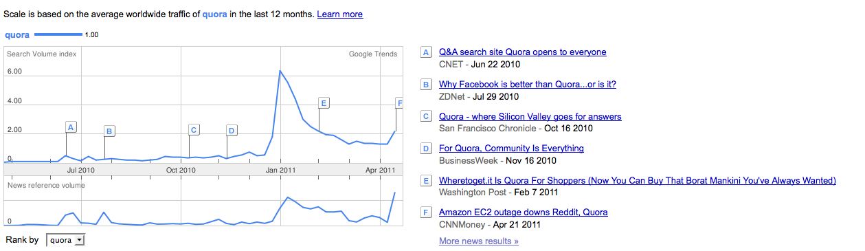 Quora körül mostanság síri csend honol, de miért? – Nos, itt még a Colornál leírtakhoz képest is óvatosabban kell fogalmaznunk, mert a Quora az egyik nagy feltörekvő sztár a Valley-ben. Mégis lassan féléve nem ad semmi igazi életjelet magáról, sőt áprilisban pár órára le is állt és ezért egyes bloggerek (sőt maga a Yahoo Finance) már elkezdtek nekimenni és vesztesnek titulálni. Persze ez talán csak átmeneti zavar, de a sztártól nem ezt várja el a Valley közössége. Már ilyesmik terjednek róla, de ez még túl korai károgás szerintünk: