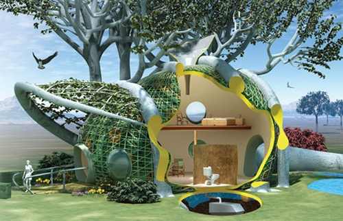 ORGANIKUS HÁZ:végül a teljesen futurisztikus organikus ház mintája az ún. FAB TREE HUB, amelyet bioépítészek találtak ki. Ez egy olyan „házfa”, amely növényekből és baktériumokból nő ki, majd a vegetáció egy számítógépesen vezérelt állványzat révén ölt ház-jelleget és alkalmas a bio-lakhatásra… Hát egyelőre lakótelepben még nem gondolkodnak!