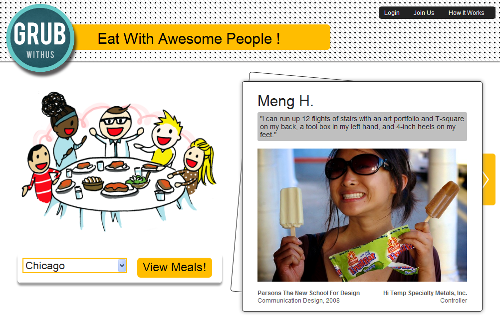 Igazán funky bizniszből csak egyet találtam a héten a GRUBwithus.com-ot, amely célja, hogy egy vacsi közben összehozza az embereket. Ugye, ismerős, anno Párizsban a LeWeb-en a Marmite hasonló sztorival nyert… Úgy látszik social startupokban mostanában menő bármiféle kaja-specifikus grouping site-ban gondolkodni.